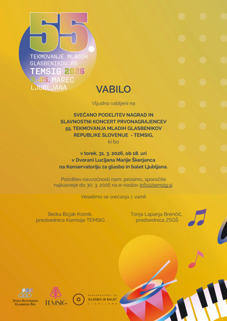 Vljudno vabljeni na slavnostno podelitev nagrad, plaket in priznanj prvonagrajencem 55. tekmovanja mladih glasbenikov Republike Slovenije – TEMSIG